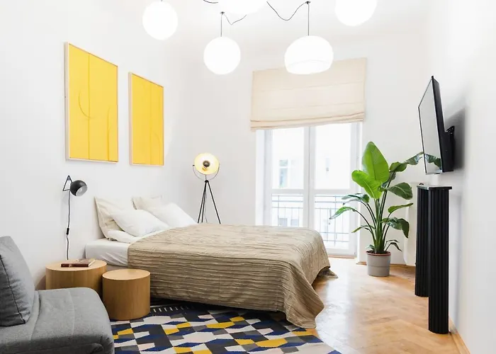 This 1-bedroom apartment lies in the old part of Warsaw, 2.6 km from the Sigismund's Column. The spacious apartment is situated 500 metres from Office and Conference Centre, just a few steps from Stadion Narodowy tube station.
